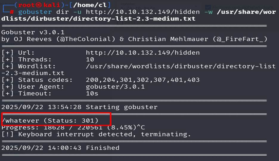 Using gobuster to find out the directory under the hidden directory