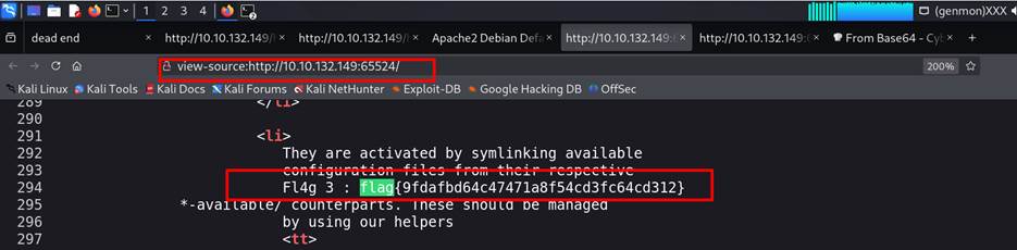 On the 10.10.132.149:65524 page view source found the flag 3