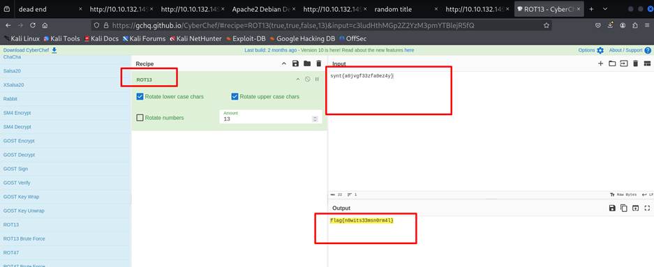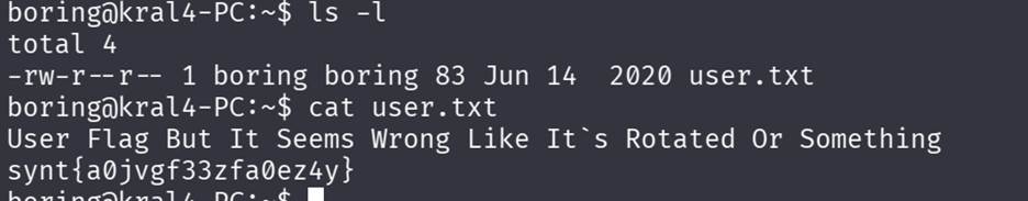 Found a file called user.txt but cant get the flag , It seems the encrypted. There is a hinted mentioning Rotated.