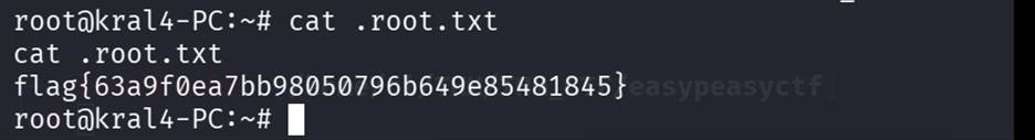 Then fond the hidden file .root.txt at the root user home directory and there found the last flag